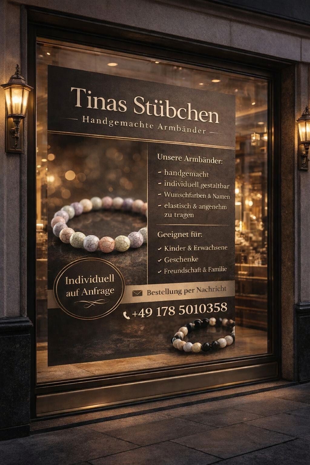 Finde nicht nur ein Armband, sondern dein ganz persönliches Lieblingsstück, das deine Individualität widerspiegelt. Bei Tinas-Stuebchen kannst du dein Armband selbst gestalten, von der Auswahl der Perlen und Farben bis hin zu den kleinen Details, die es einzigartig machen. Erlebe die Freude, etwas zu tragen, das nur für dich geschaffen wurde.